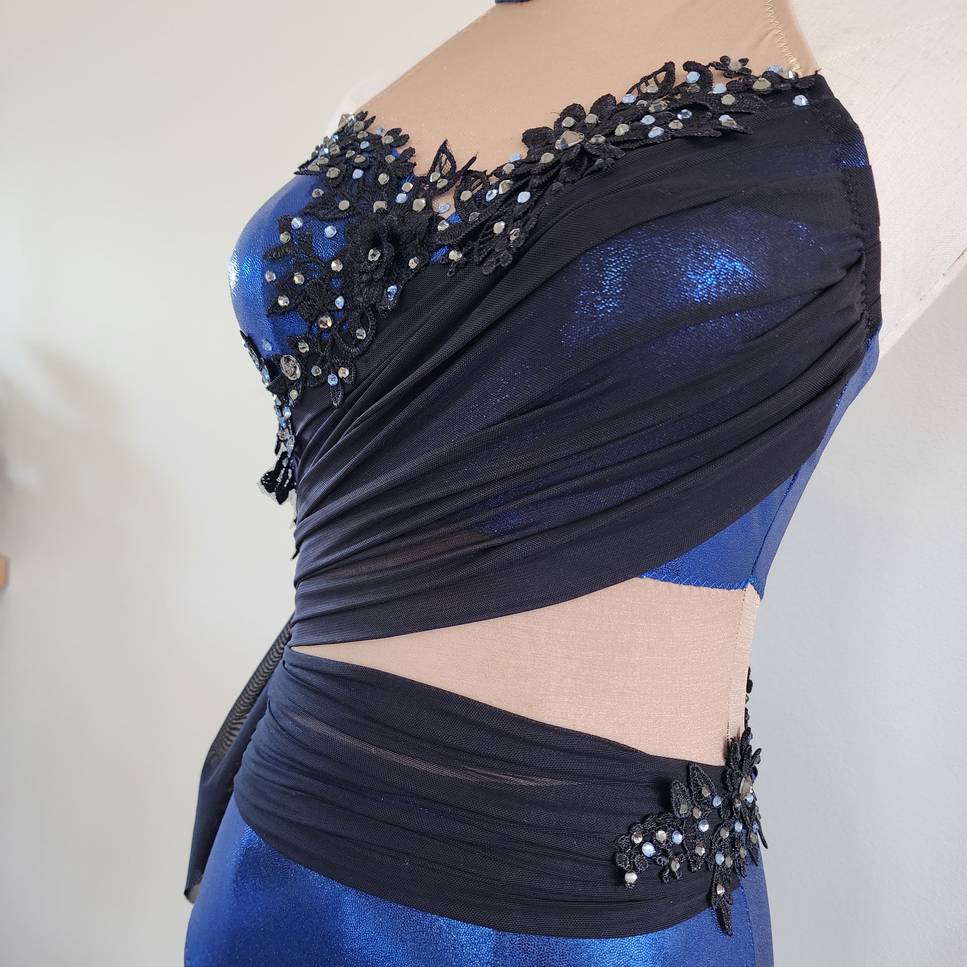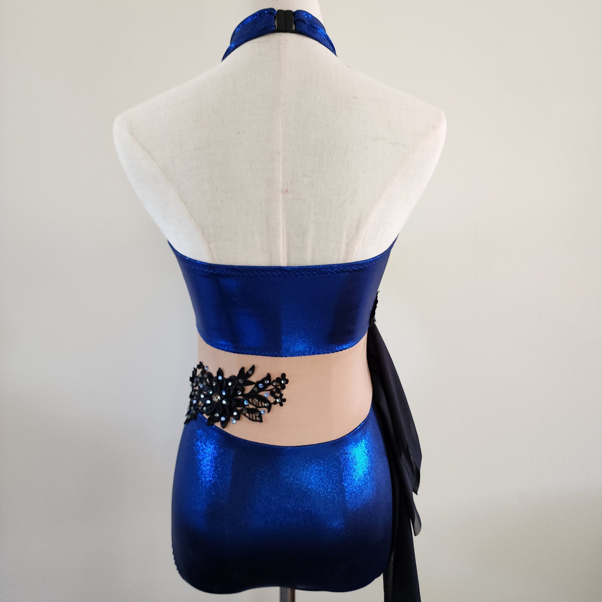 Enhance your glam with our Glamour halter neck leotard. The striking black and blue design with intricate black appliqués and mesh detail is sure to turn heads. Complete with a cute side skirt and sparkling crystal rhinestones. Custom colors available upon request. Elevate your style now.